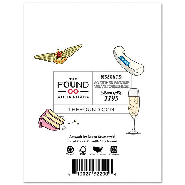 • A2 folded card, 5.5" x 4.25" folded • Ecru euroflap envelope • Locally printed on recycled paper from an FSC-certified mill with soy-based inks Message: SO KEEP ON DANCING TILL THE WORLD ENDS