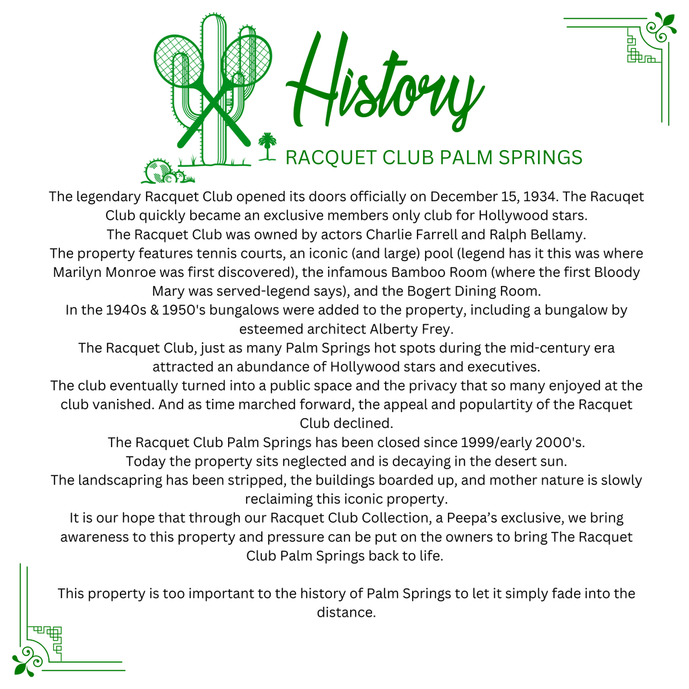 The Racquet Club Palm Springs opened its doors in 1934. It's owners, Charels Farrell and Ralph Ballamy forever changed the trajectory of Palm Springs with the opening of this legendary property.
